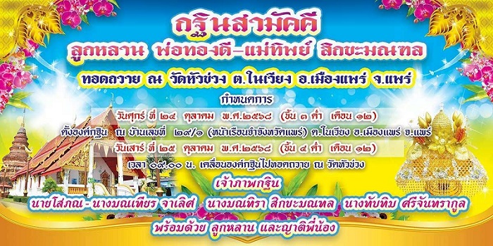 กฐินสามัคคี ลูกหลานพ่อทองดี - แม่ทิพย์ สิกขะมณฑล 25 ต.ค. 2568 Version_U8Nov_2025 ทอดถวาย ณ วัดหัวข่วง ปรับปรุงเมื่อ 8 พ.ย. 2568 (6 นาที 30 วินาที ) ***** |