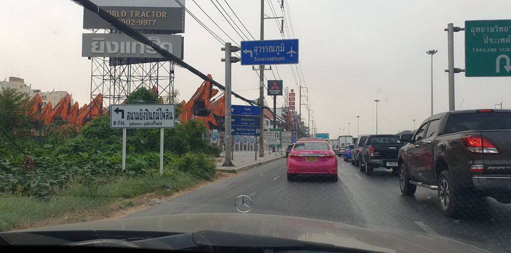 ถ้าตรงไปอีก ขึ้นสะพานต่างระดับอีก วิ่งตรงไป ข้ามคลอง ตรงไป สามารถไปพัทยา ไปสนามบินสุวรรณภูมิ ได้ (ดูป้ายบอกทาง)
