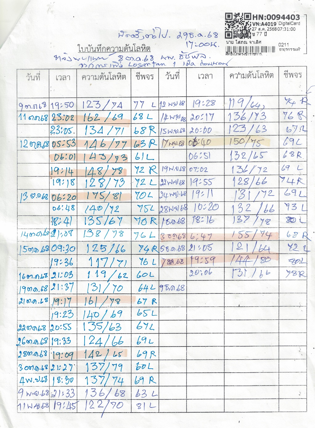 โชติวงศ์วชิระ ได้สั่งจ่ายไว้แล้วขอติดตามผล 27 ส.ค. 2568 ปรากฏว่า BP ยังสูง จึงให้ทานยา Losartan 50 mg เพิ่มอีก 1 เม็ดในมื้อเย็น และนัด