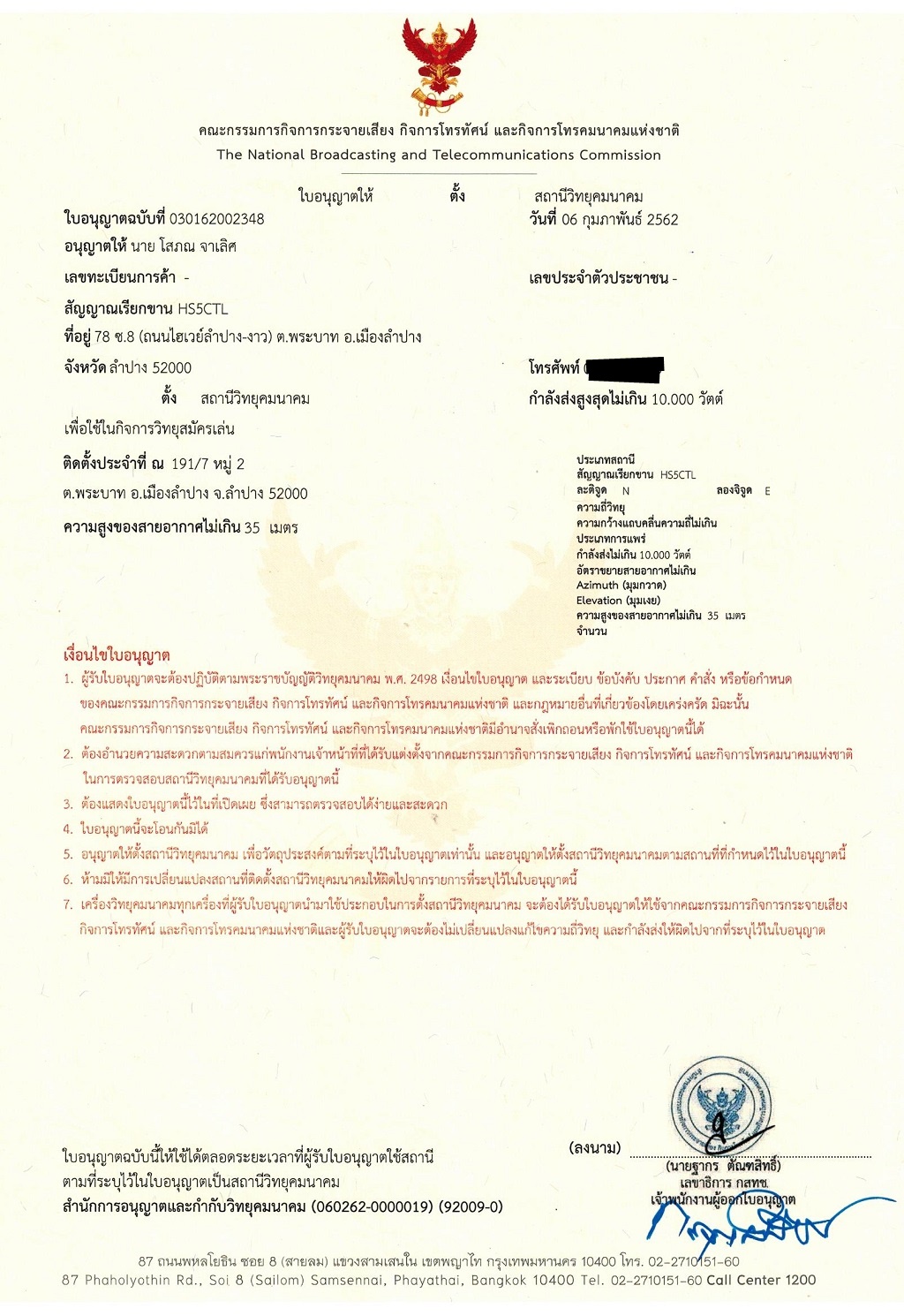 ใบอนุญาตให้ใช้เครื่องวิทยุคมนาคม กำลังส่ง 10W. ติดรถยนต์ ตราอักษร KENWOOD รุ่น TM-241EJ