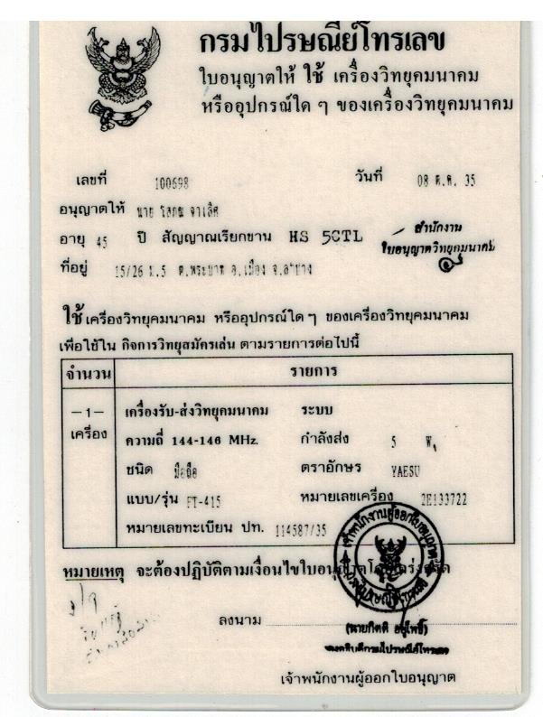 เลขที่ 100698 YAESU รุ่น FT 415 หมายเลขเครื่อง 2E133722 หมายเลขทะเบียน 114587/35