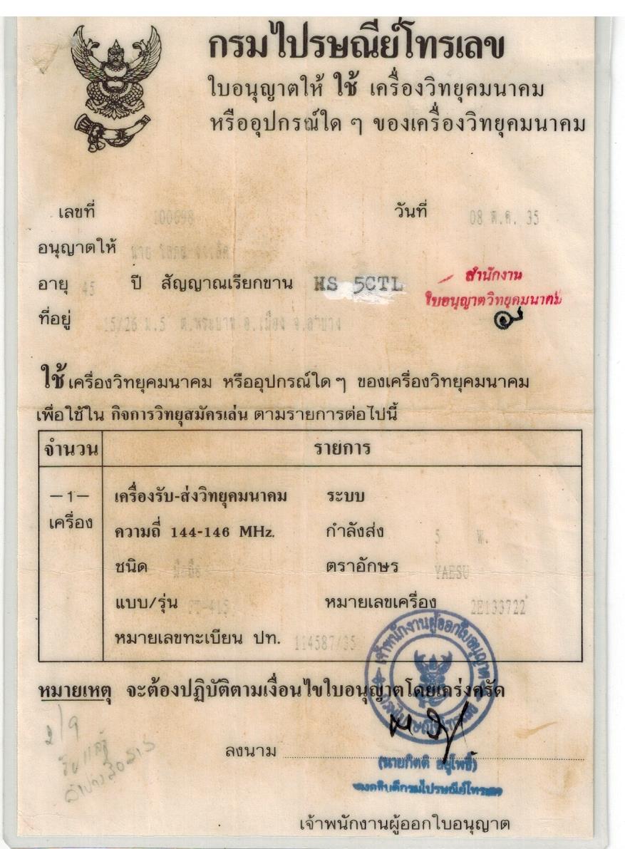 เลขที่ 100698 YAESU รุ่น FT 415 หมายเลขเครื่อง 2E133722 หมายเลขทะเบียน 114587/35