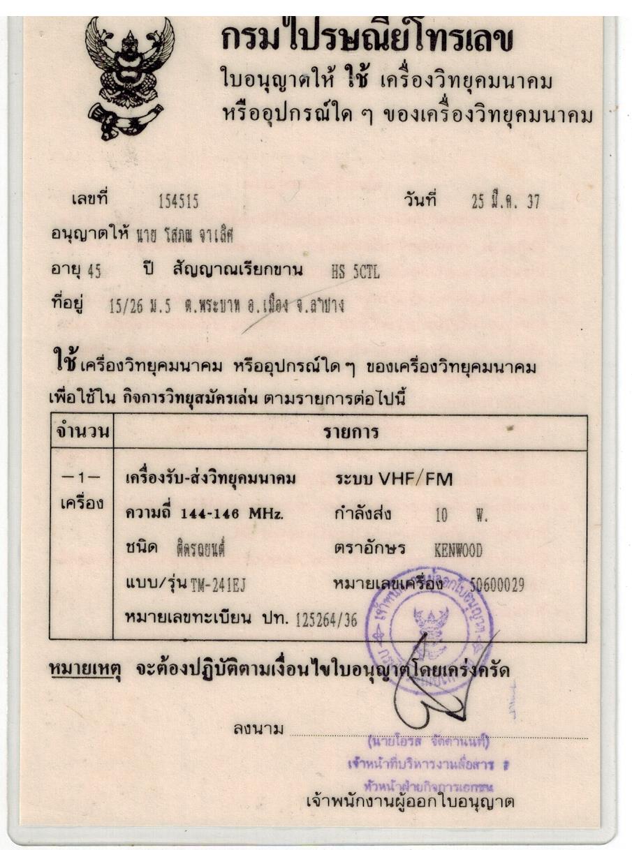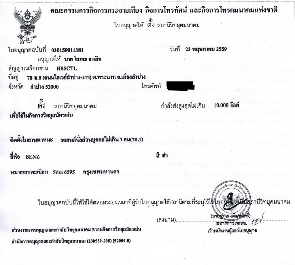 ใบอนุญาตให้ใช้เครื่องวิทยุคมนาคม กำลังส่ง 10W. ติดรถยนต์ ตราอักษร KENWOOD รุ่น TM-241EJ